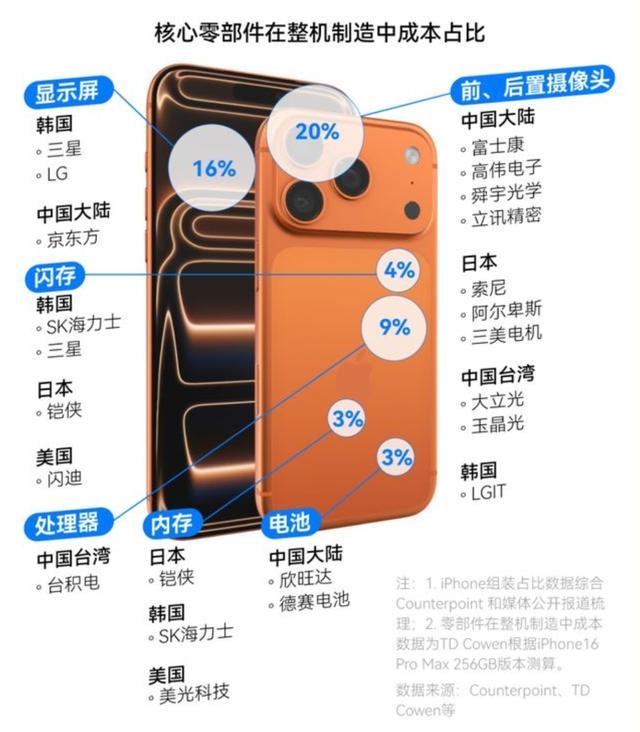 我们可以看看下面这张图,苹果17的核心零部件中,闪存、内存在整个成本中,占到了7%。